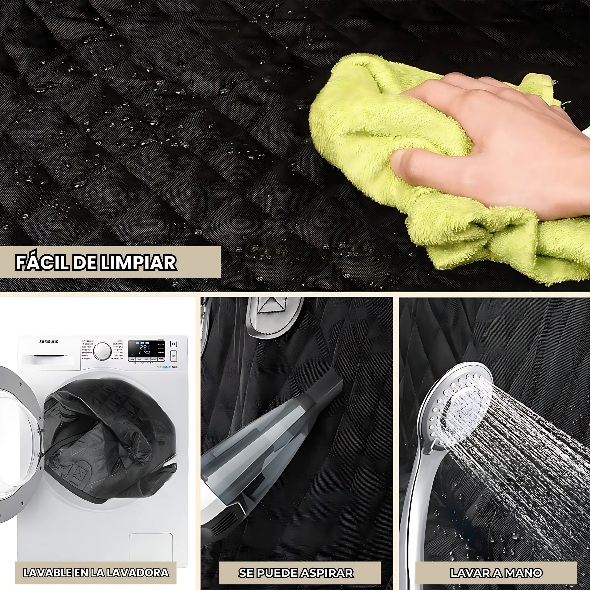 Impermeable y fácil de limpiar: gracias a su tejido Oxford 600D con 4 capas y revestimiento impermeable. Un paño húmedo, aspiradora o lavadora ¡y queda como nueva! Instalación en menos de 1 minuto: coloque las correas, ajuste los clips y abra las ranuras del cinturón… ¡listo!